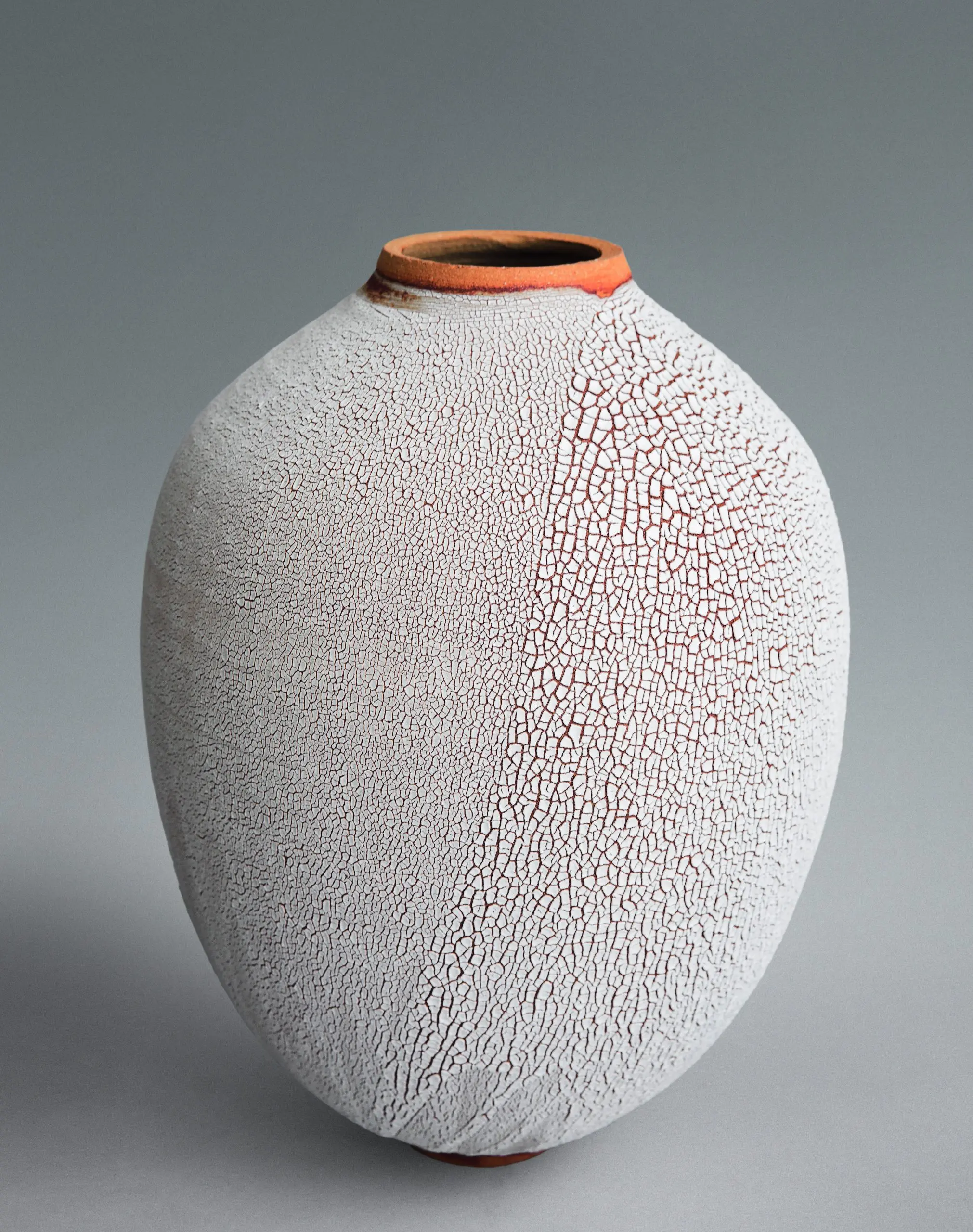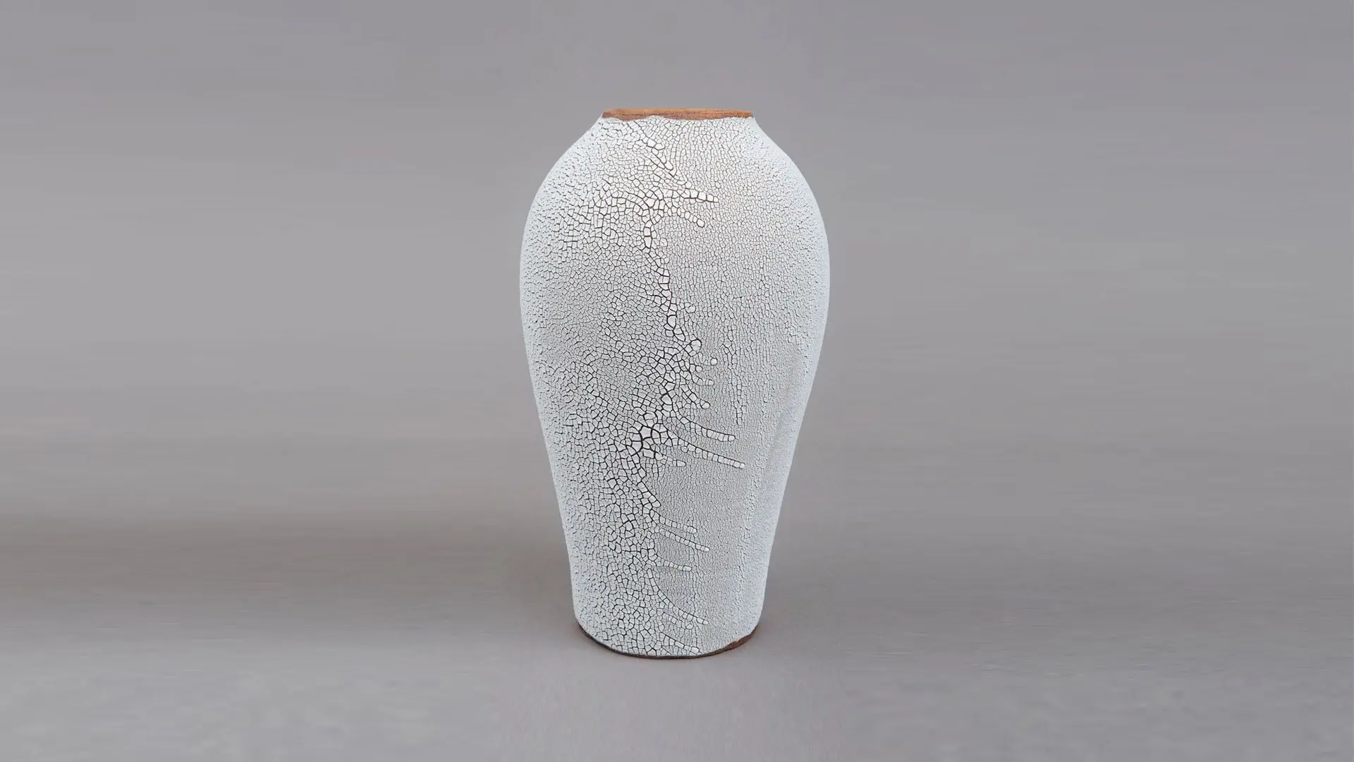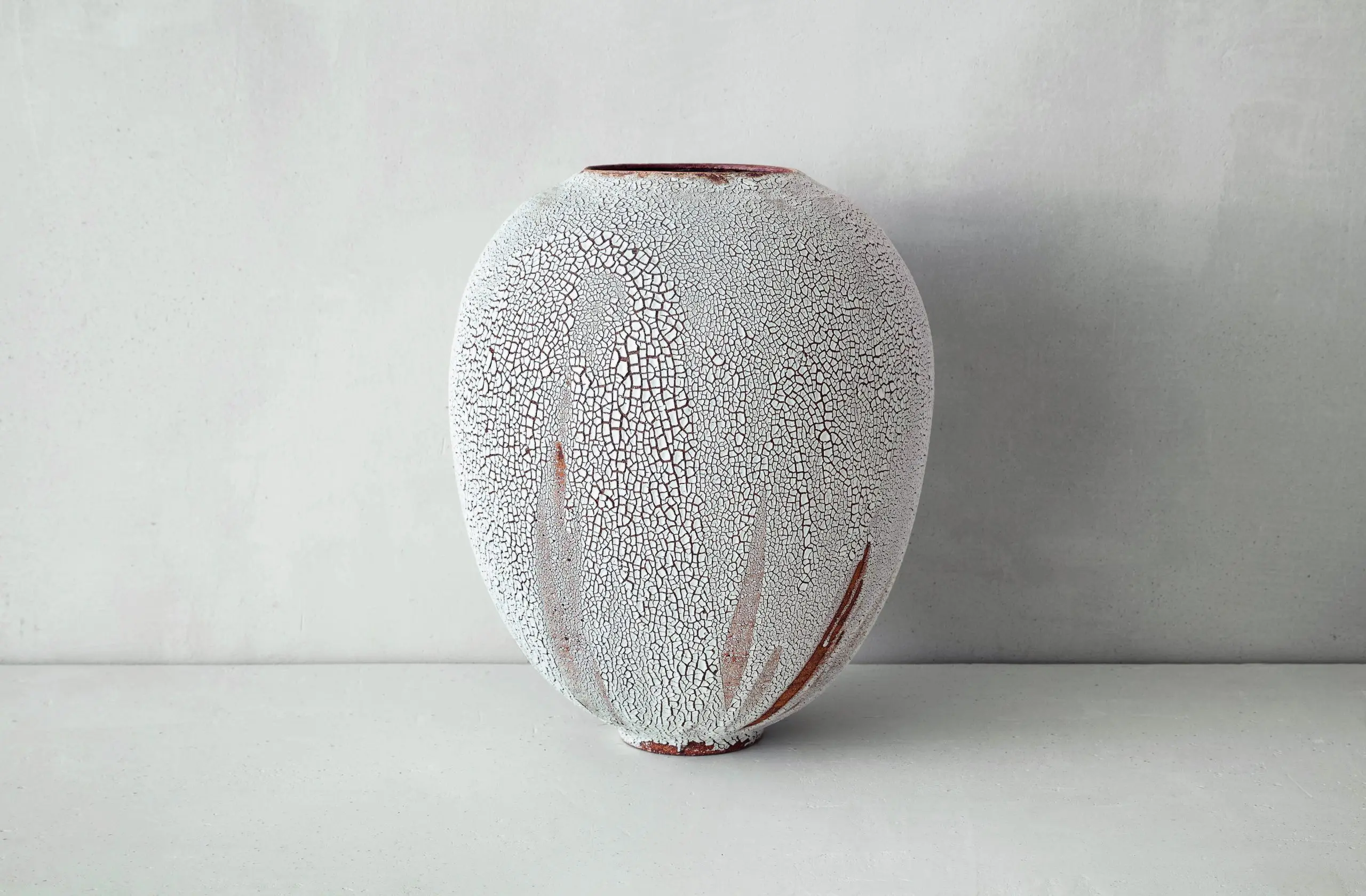 Pour parvenir à ce rendu si particulier, Karen Swami a développé un émail blanc enrichi en cendre d’os. Cette composition unique permet à la surface de se fissurer naturellement lors de la cuisson, évoquant les terres desséchées ou les peaux précieuses comme le galuchat. Au fil de ses expérimentations, la céramiste a varié les dosages, les oxydes métalliques et les types de terres, donnant naissance à une large palette de textures et de teintes. Ainsi, selon la lumière et l’angle de vue, chaque vase céramique blanc craquelée révèle des nuances qui rappellent tantôt le monde animal, tantôt l’univers minéral ou végétal.